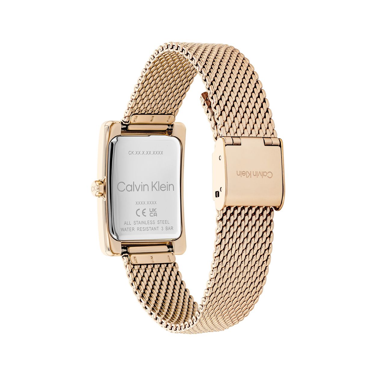 Dit Calvin Klein dameshorloge met nr CK25200395 is een chique ontwerp. De rosékleurige rechthoekige stalen kast heeft een fijne bolling in de rand, dit geeft het klokje een stijlvol uiterlijk. Op de groene sunray wijzerplaat zijn de fijne wijzers mooi zichtbaar en staat de naam Calvin Klein afgedrukt. Aan de gladde kast zit een rosékleurige milanese band. Het sierlijke horloge heeft een mineraalglas, een doorsnee van 22,5mm en is 3 ATM.