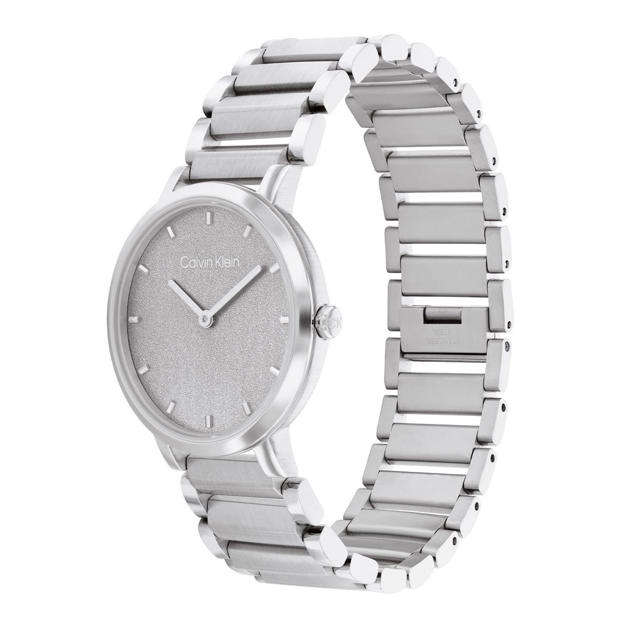 Dit Calvin Klein dameshorloge met nr CK25200085 heeft een strak en minimalistisch ontwerp. De stijlvolle ronde gladde stalen kast heeft een zilverwitte wijzerplaat waarop een fijne uurs aanduiding, fijne wijzers en het logo zichtbaar zijn. Direct aan de kast zit een stalen opengewerkte schakelband. Het stijlvolle horloge heeft een mineraalglas, een doorsnee van 34mm en is 3 ATM.