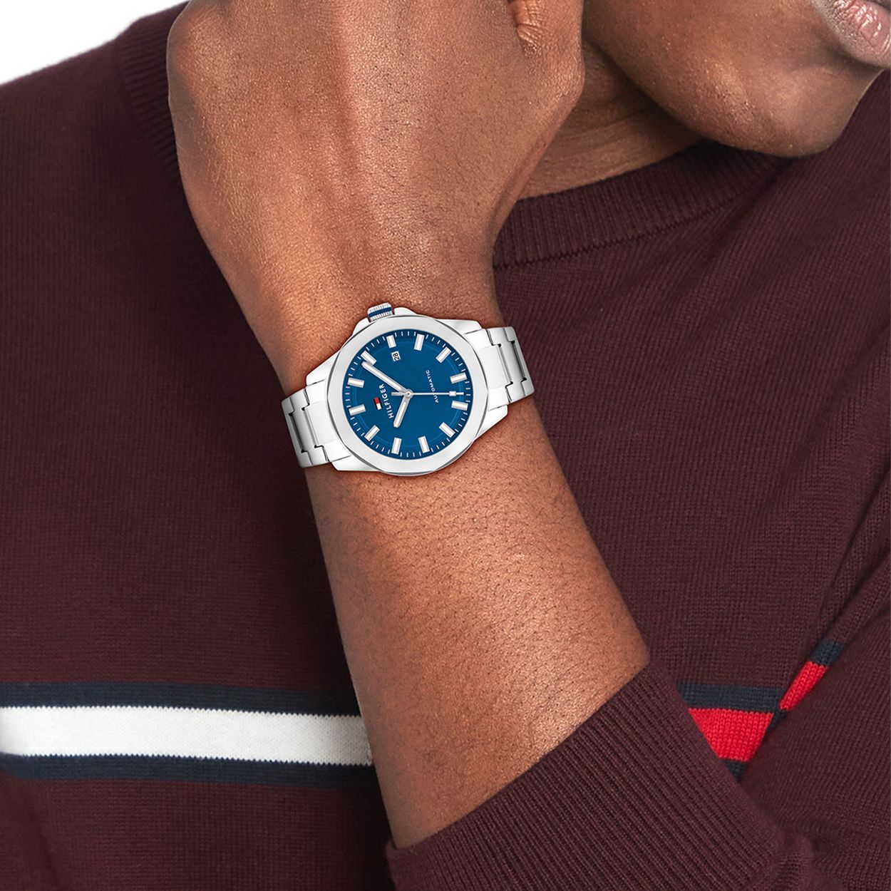 Dit specifieke horloge van Tommy Hilfiger uit de Lars serie met artikelnr: TH1710693 is een stijvol herenhorloge die niet in je collectie mag ontbreken. Het herenhorloge heeft een stalen kast met 10 hoekige bezel en een blauwe wijzerplaat met een datum en lumibrite inleg in de wijzers en uurstrepen. Dit model heeft een automatisch uurwerk en loopt op de beweging van de pols. Aan de kast zit een stalen schakelband met een vouwsluiting. Het horloge heeft een mineraalglas, een afmeting van 42mm en is 5ATM.